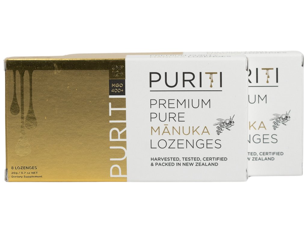 Mějte vždy v zásobě PURITI Mānuka UMF™ 12+ Pastilky s nezávislým certifikátem UMF™ 12+ a MGO 400+. Je možné si zakoupit standartní balení obsahující 8 pastilek nebo větší balení s 16 pastilkami. Pastilky jsou ideální pro zklidnění bolesti v krku. Doporučujeme je mít u sebe v zimě na cestách.